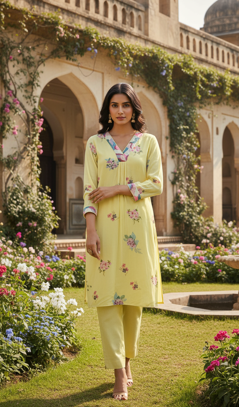 Striking yet understated, this beautiful kurta is adorned with intricate hand-illustrated florals in soft, contrasting hues with radiant cut beads embroidery in multi colour along the neckline and cuff detail on the sleeves. The elongated high low silhouette and subtle detailing at the neckline and cuffs create a flattering, contemporary look. Designed to transition seamlessly from day to evening, this piece balances modern festive indian wear with artisanal craftsmanship.